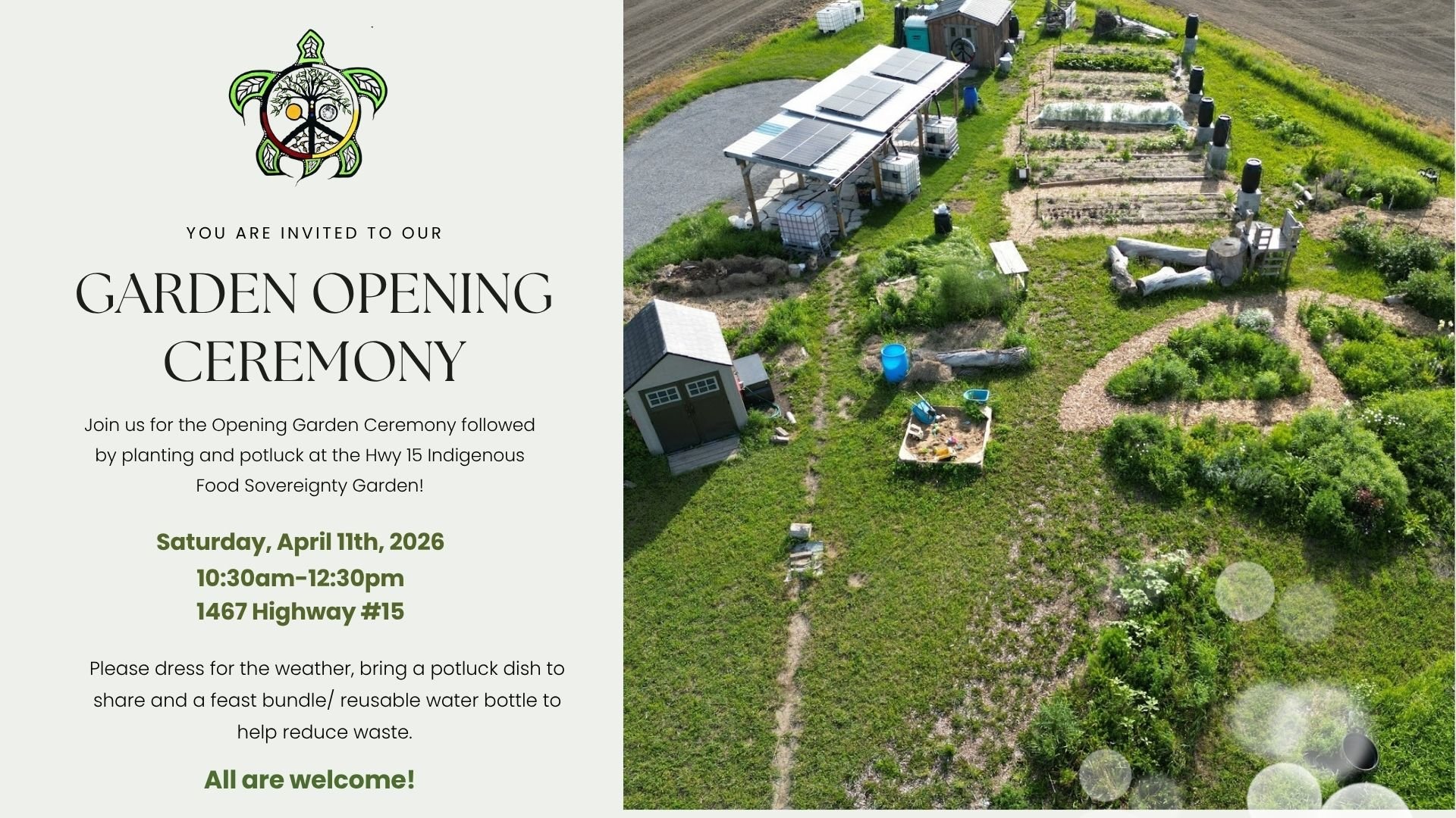 It’s time to open the garden! Join us for the Opening Garden Ceremony, followed by planting and potluck at the Hwy 15 Indigenous Food Sovereignty Garden: