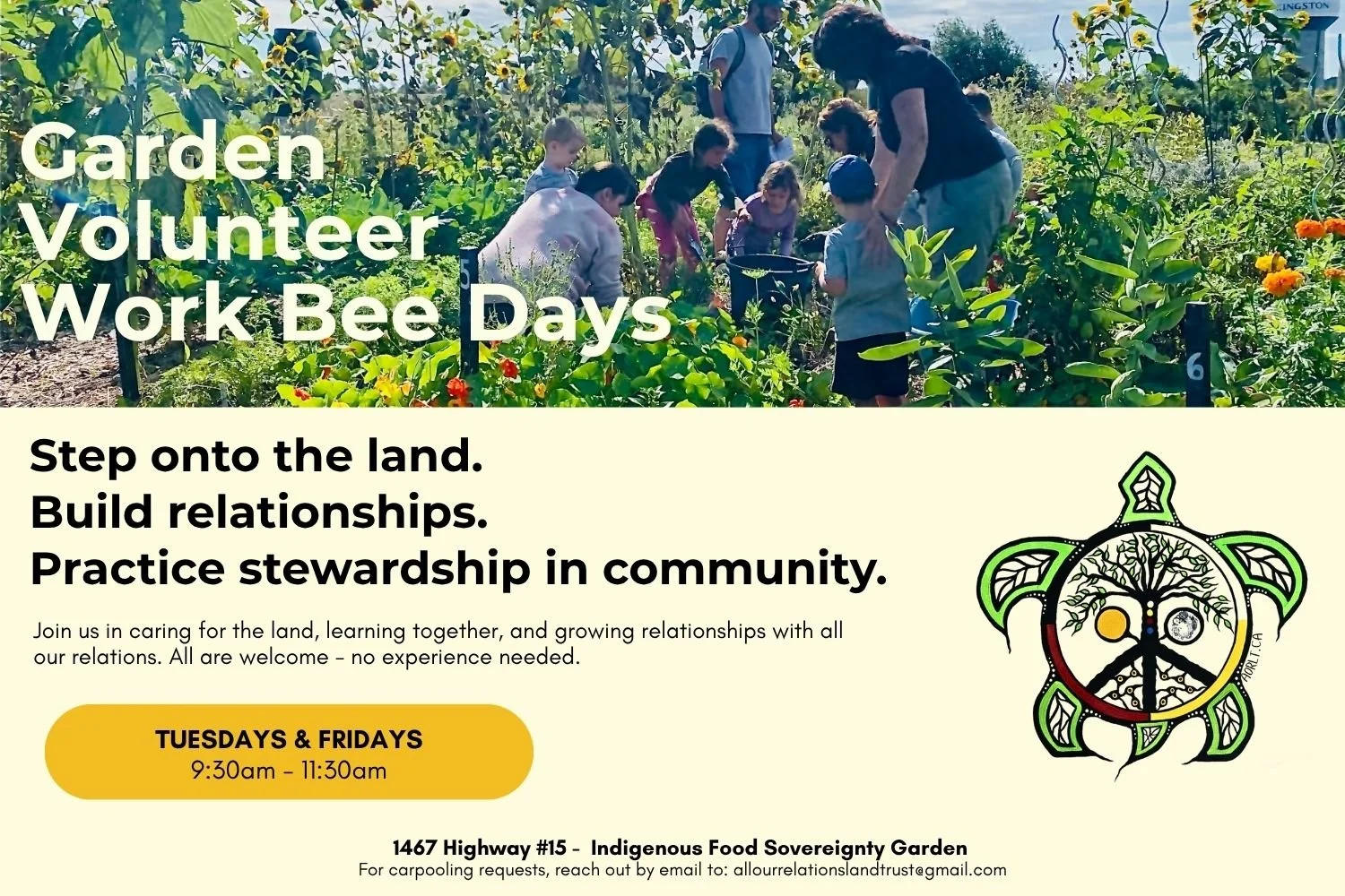 Back to All Events Garden Volunteer Work Bee Monday, April 27, 2026 6:00 p.m. 7:00 p.m. Hwy #15 Indigenous Food Sovereignty Garden 1467 Kingston 15 Kingston, ON, K7K 7J9 Canada (map) Google Calendar ICS Join us Tuesdays and Fridays from 9:30-11:30am to care for the land in community. Everyone is welcome If you need to arrange for a carpool, please reach out to us at allourrelationslandtrust@gmail.com